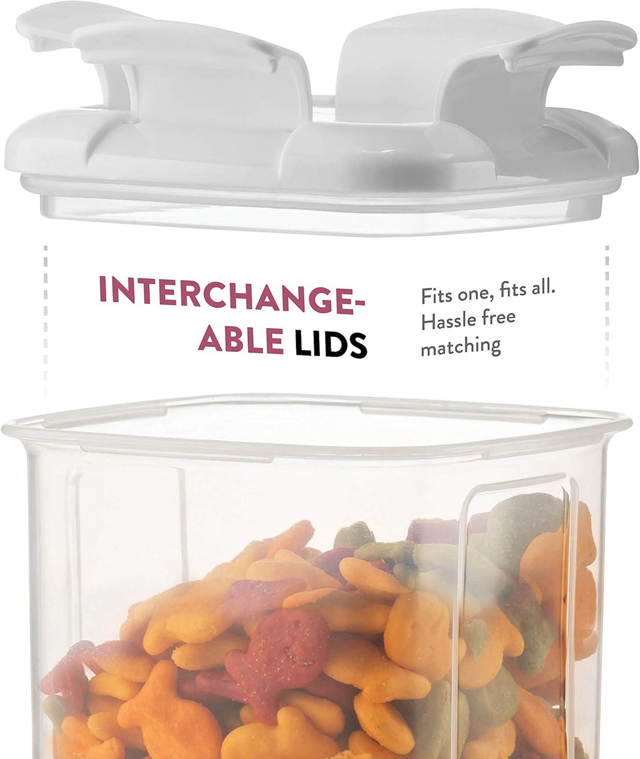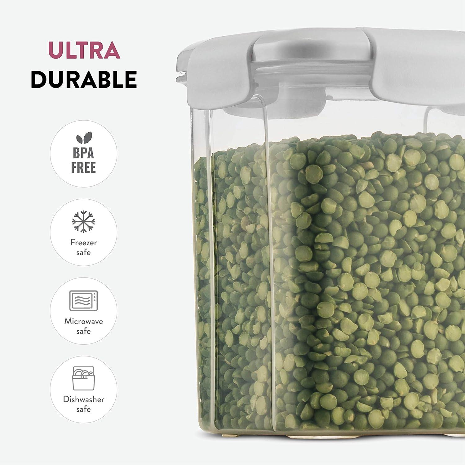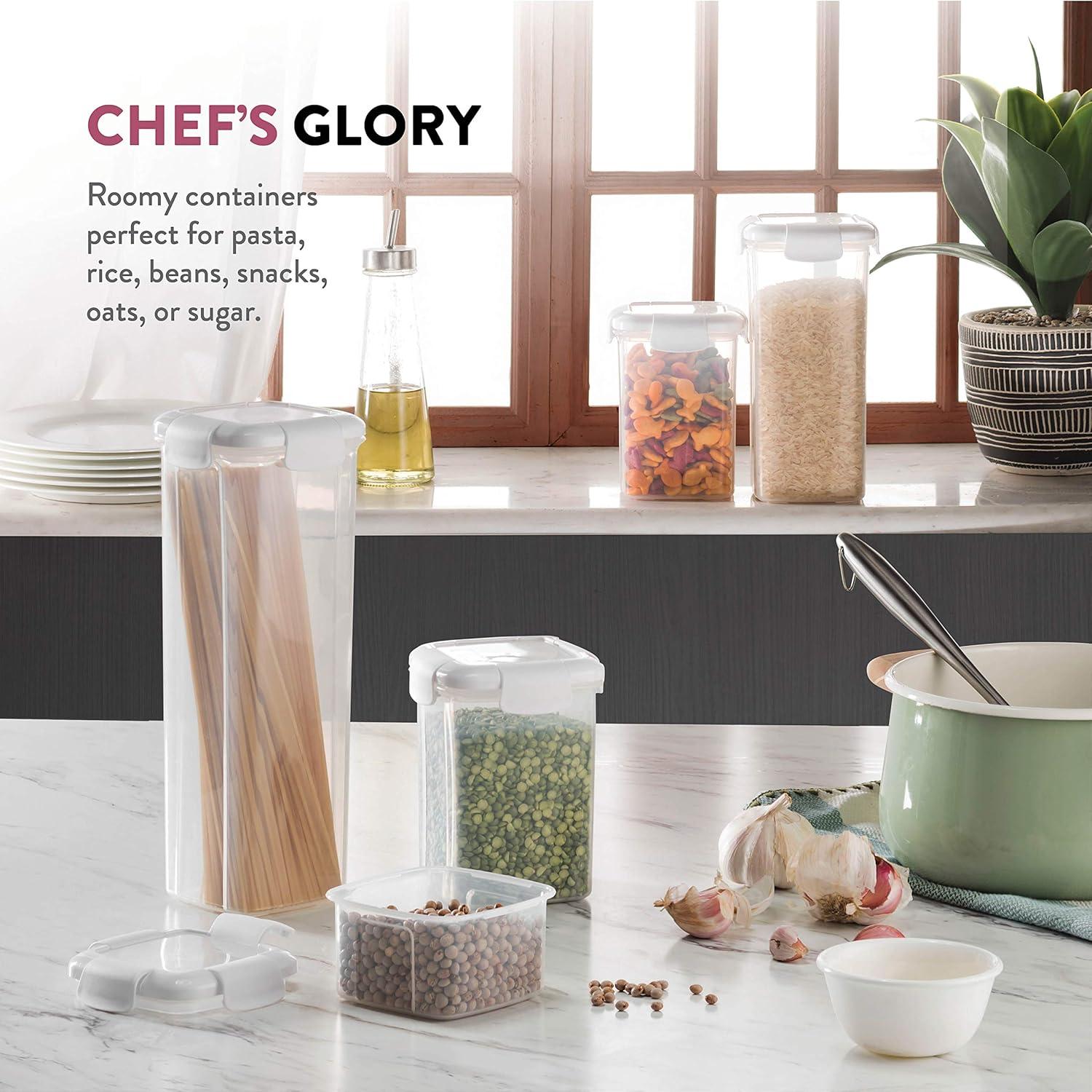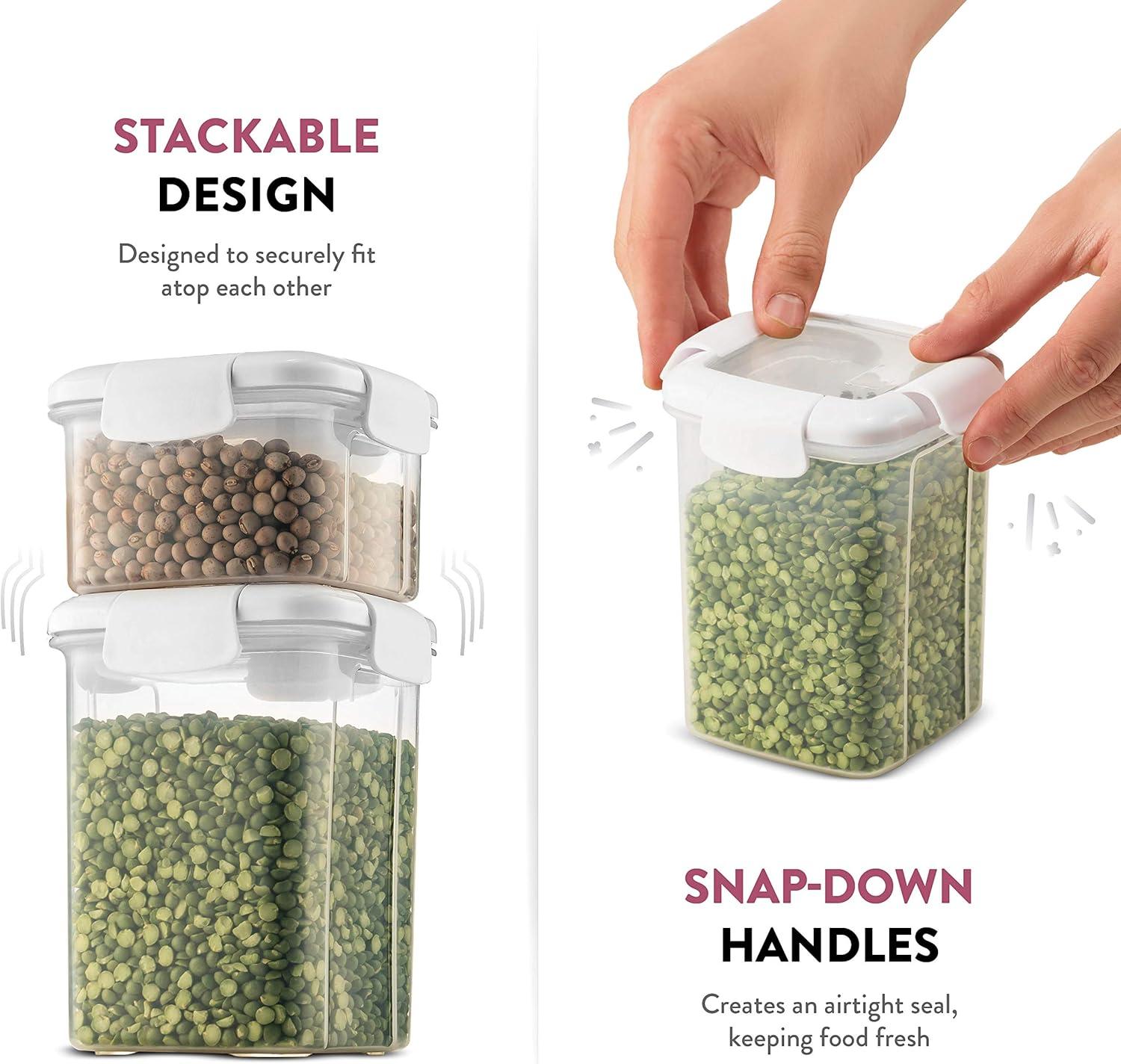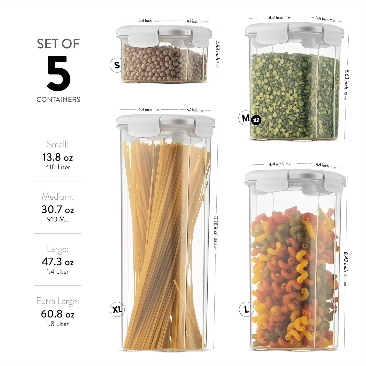 VERSATILE CONTAINERS: This set includes 5 clear, roomy containers. There is one 13.8 oz container, just what you need for snacks or spices, 2 are of 30.7 oz for beans or lentils, one 47.3 oz perfect for rice or oats. and one 60.8 oz for pasta. Lids and containers are interchangeable for ease and convenience.