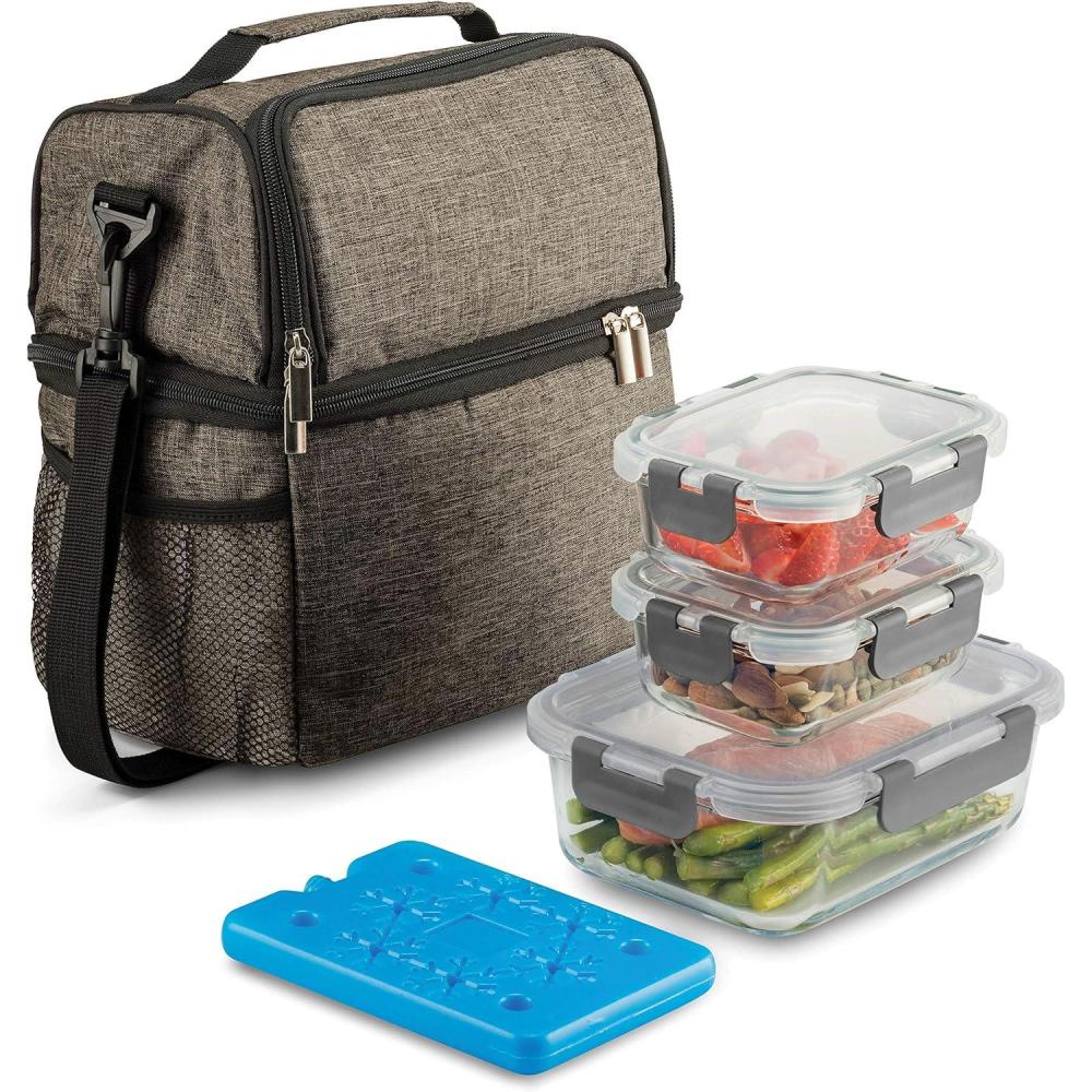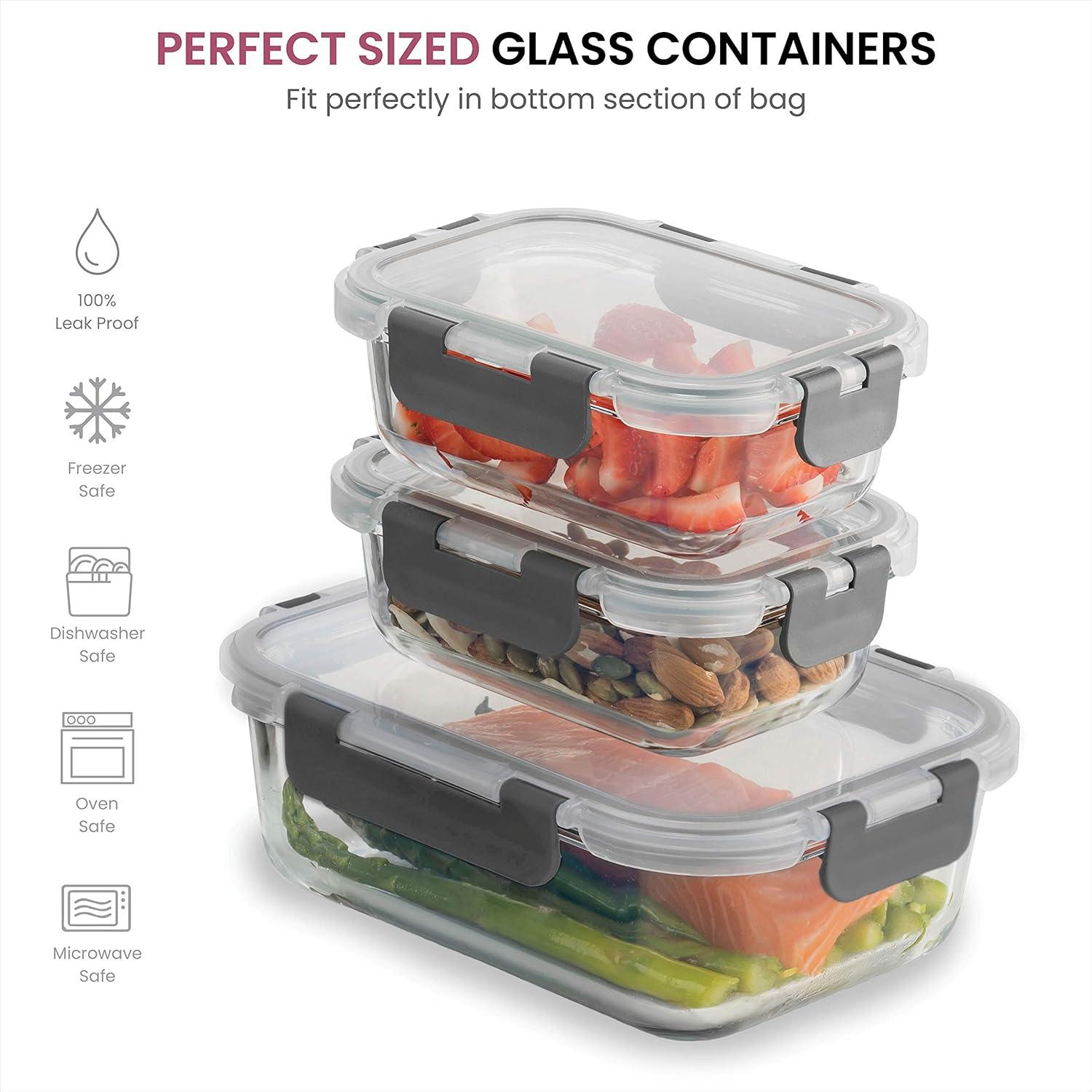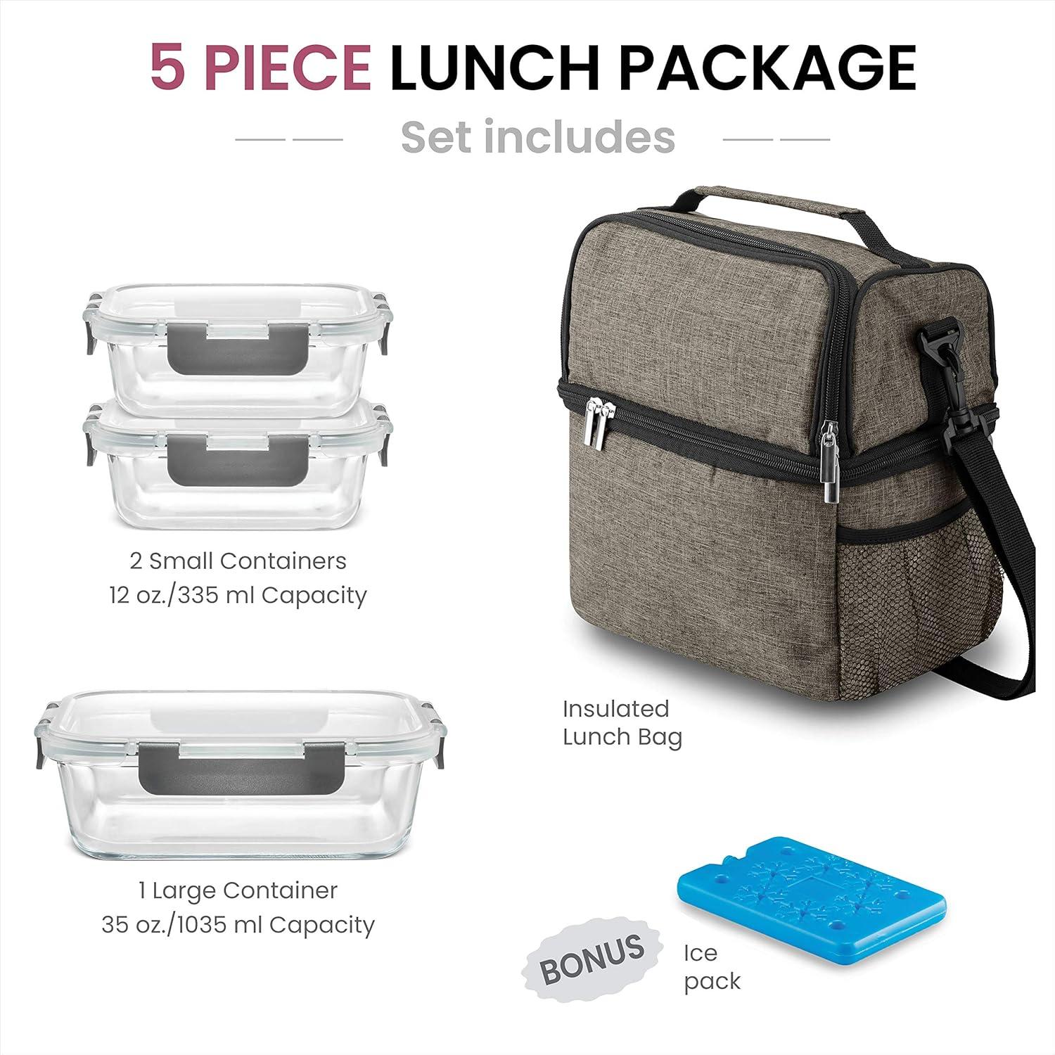 ALL-INCLUSIVE LUNCH BAG – Our 8-piece set includes a durable bag, ice pack, and 3 glass containers with BPA-free locking lids (12 oz and 35 oz).