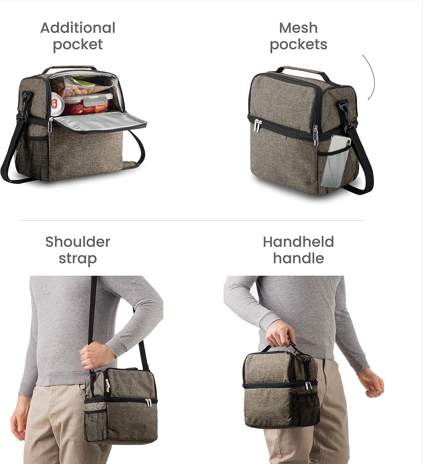 ROOMY AND SECTIONAL – Our bag has two roomy compartments, with the bottom section perfectly fitting the containers and the top section for loose foodstuffs. Mesh side pockets are ideal for drink bottles or cellphone chargers.