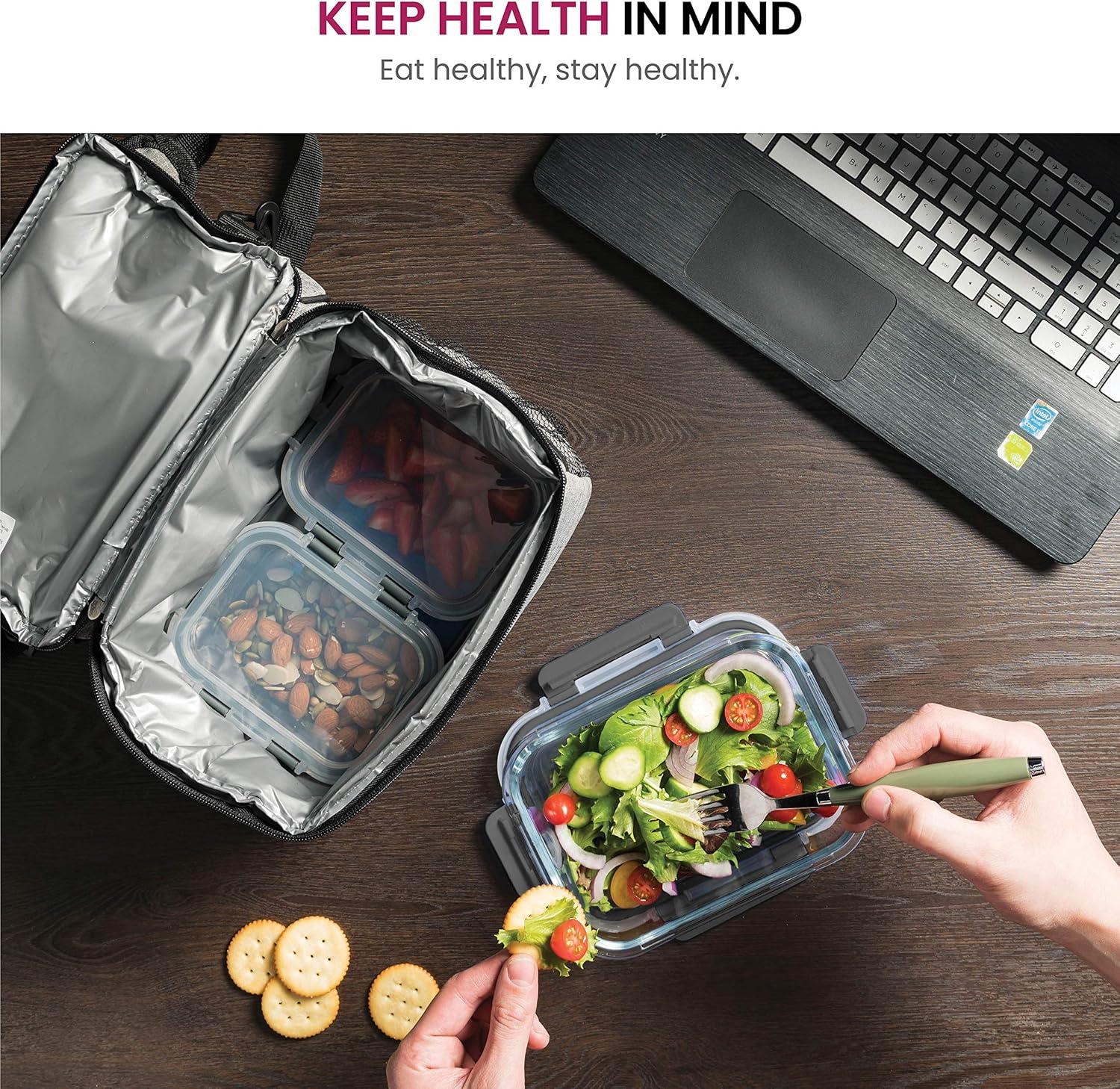 ALL-INCLUSIVE LUNCH BAG – Our 8-piece set includes a durable bag, ice pack, and 3 glass containers with BPA-free locking lids (12 oz and 35 oz).