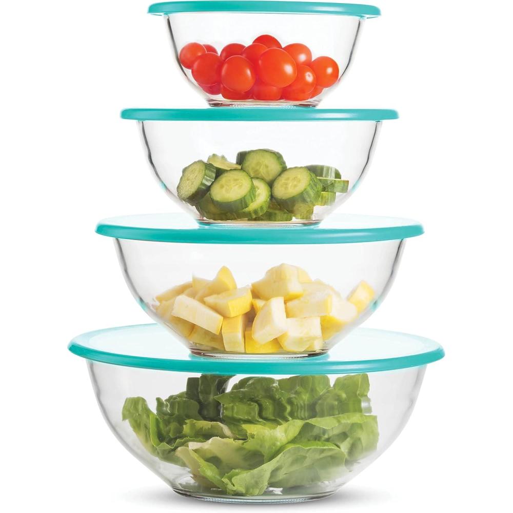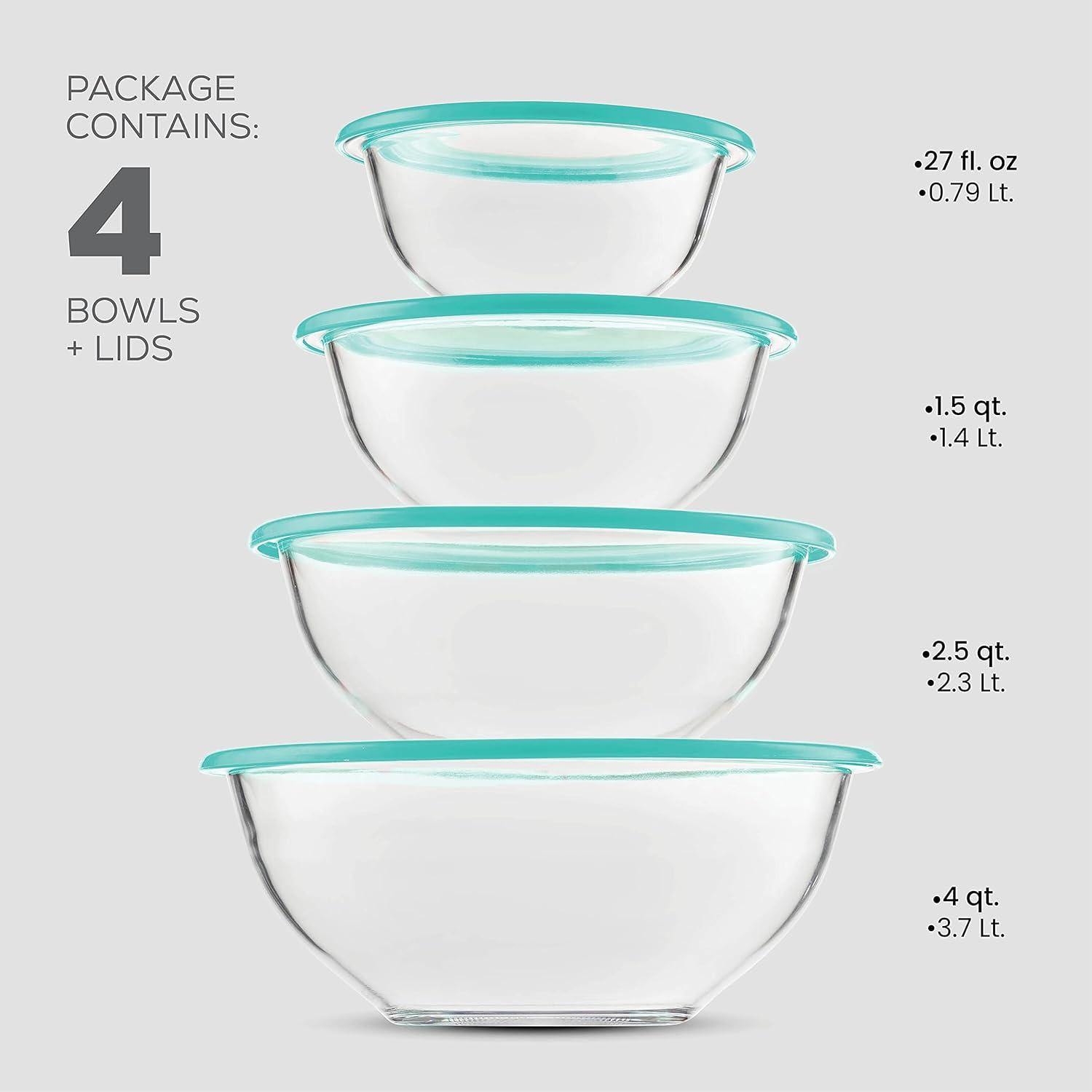 EASILY STORE and CLEAN – The set includes bowls of 4 qt, 2.5 qt, 1.5 qt, and 27 fl. Oz. The bowls are stackable and neatly nest inside each other. The bowls are dishwasher safe, while the lids should be washed by hand.