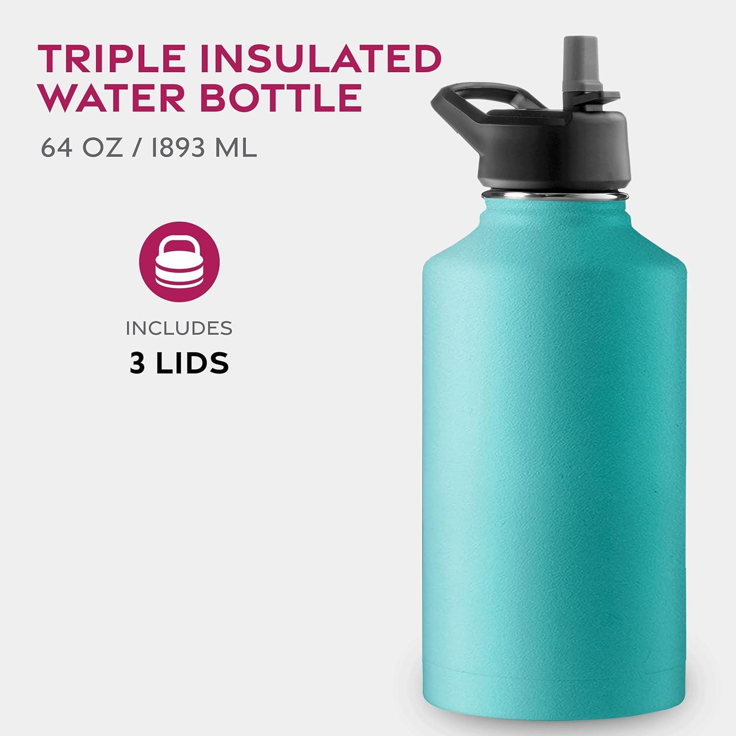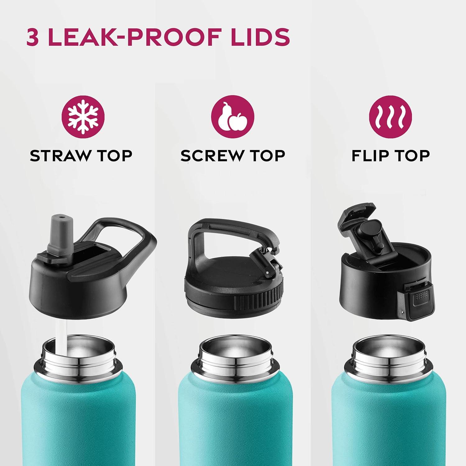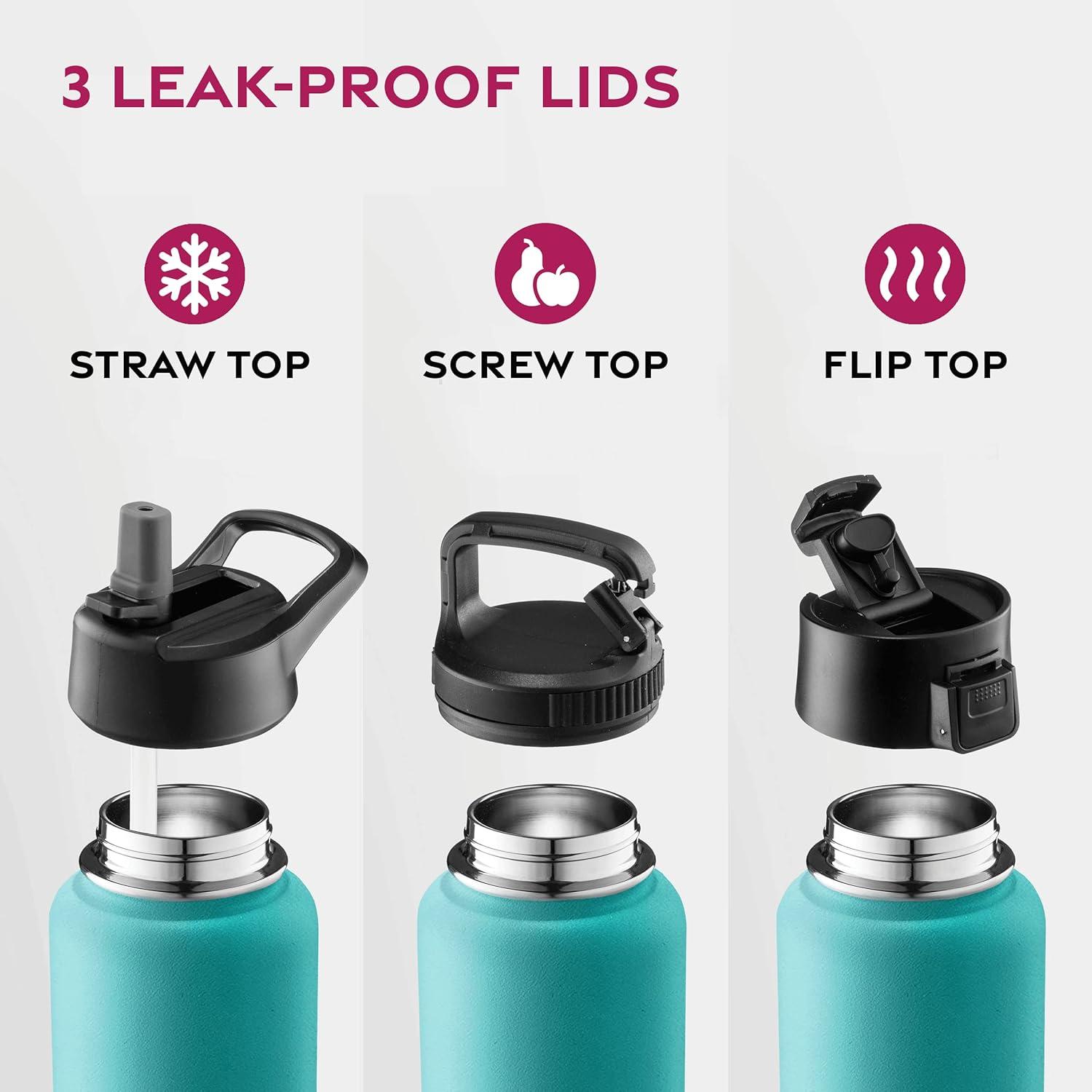 VERSATILE LIDS: Our drinking bottle comes with three individual lids to serve all your needs. Sip hot drinks with the mouthpiece, enjoy cold beverages with the straw, and use the removable lid for ice or fruit drinks. All tops offer leak proof seals.