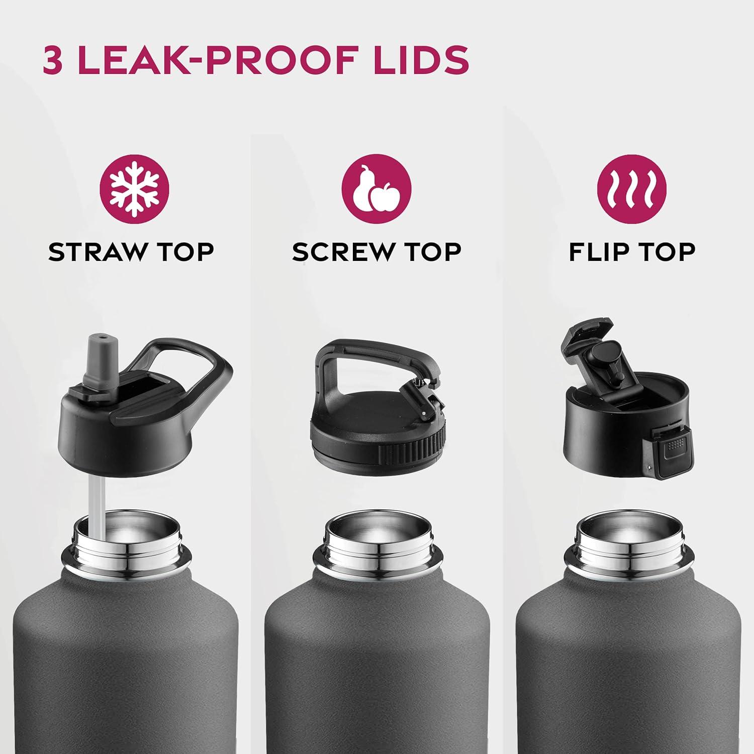 VERSATILE LIDS: Our drinking bottle comes with three individual lids to serve all your needs. Sip hot drinks with the mouthpiece, enjoy cold beverages with the straw, and use the removable lid for ice or fruit drinks. All tops offer leak proof seals.