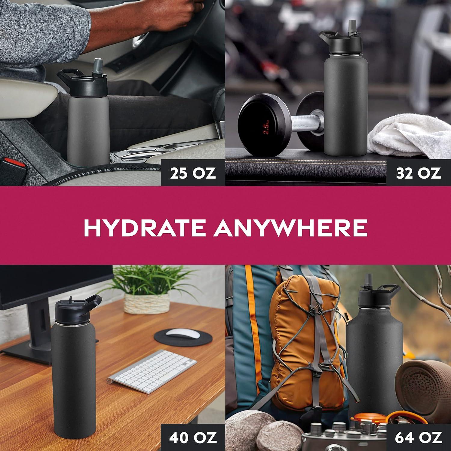 TRAVEL-FRIENDLY: Carry it with ease or attach it to a backpack with the built-in handle. The large capacity makes it perfect for hikes, bike rides, camping trips, or the gym. NOTE: Only the 25 Oz size fits in standard cupholders.