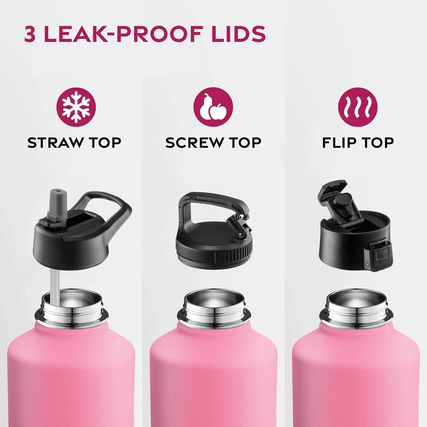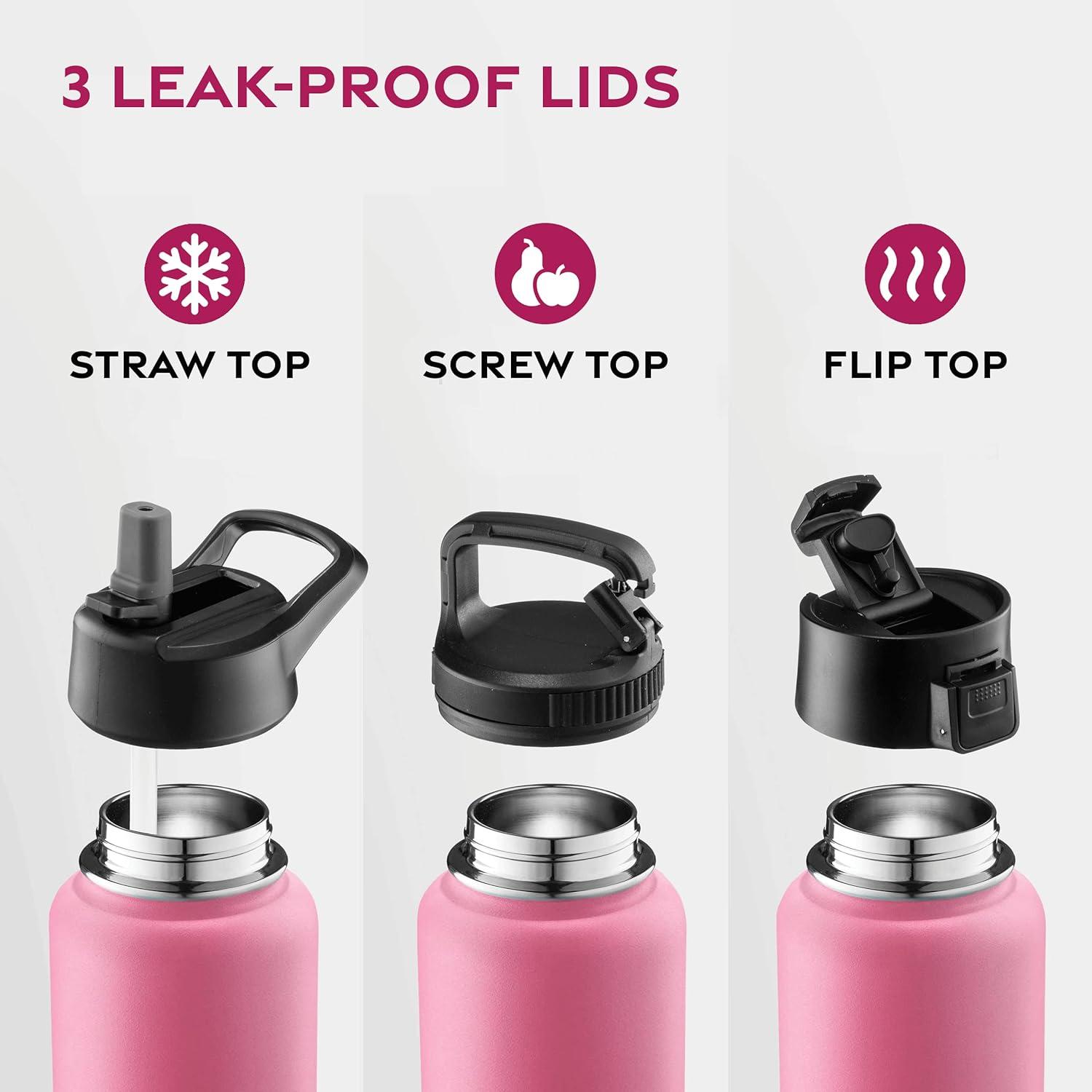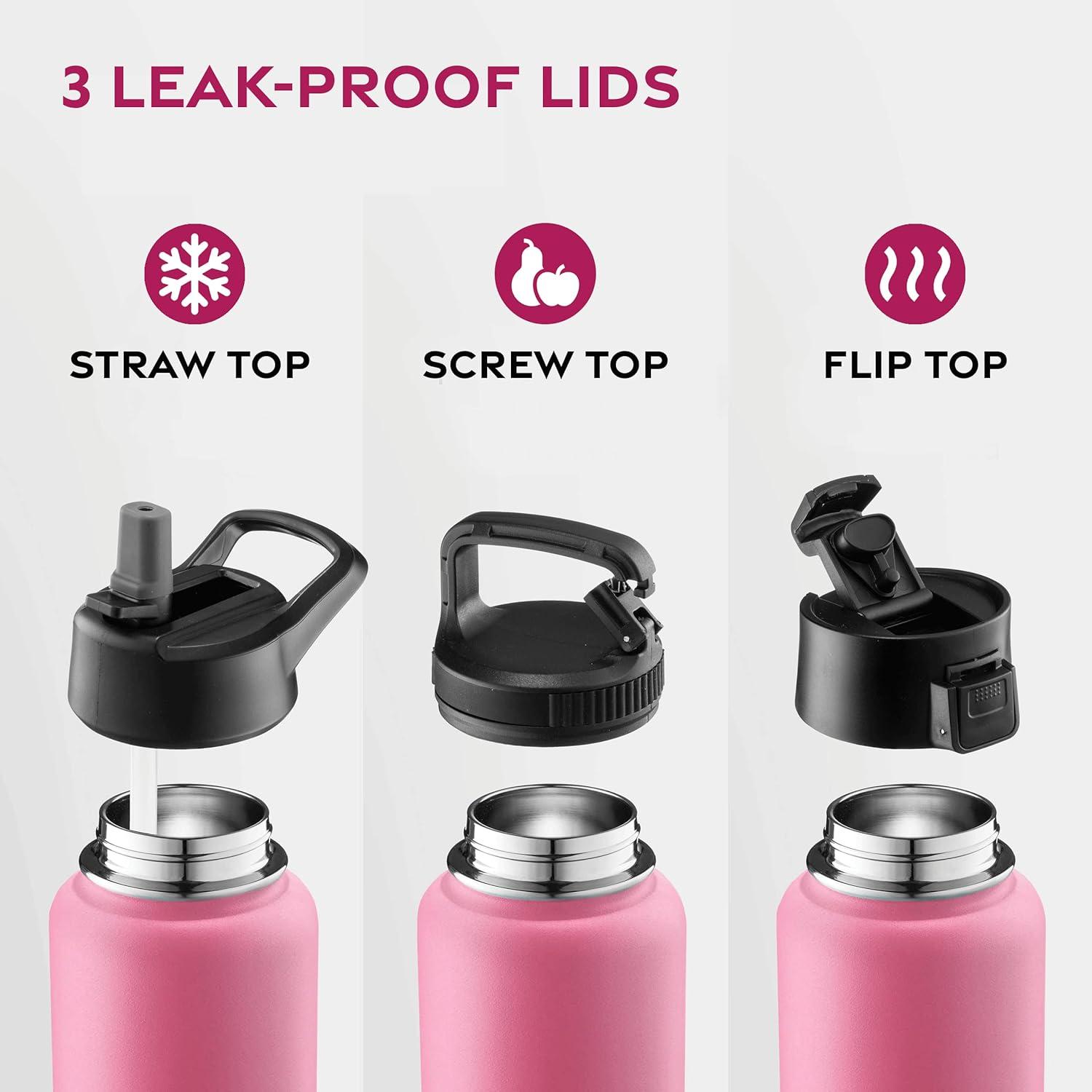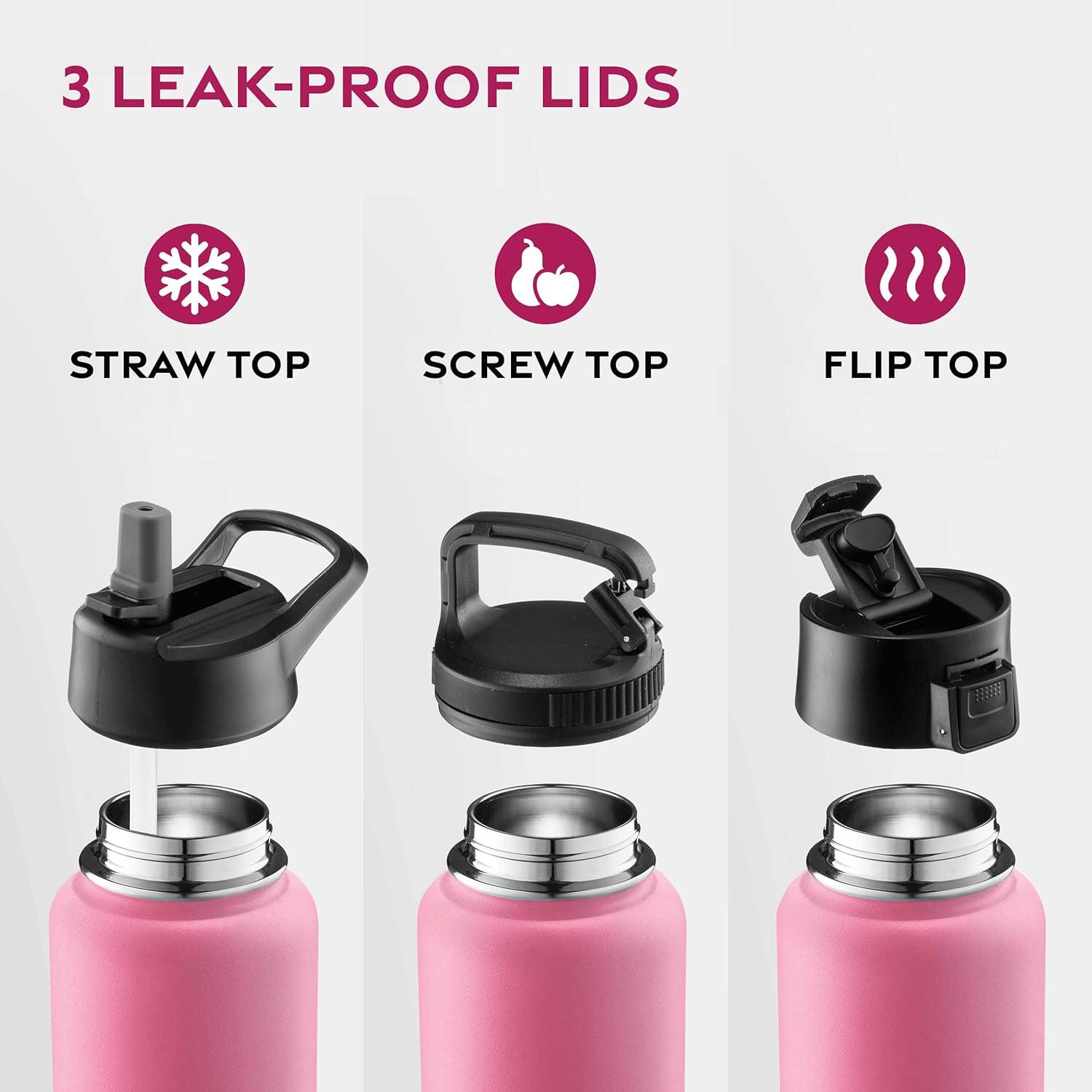 VERSATILE LIDS: Our drinking bottle comes with three individual lids to serve all your needs. Sip hot drinks with the mouthpiece, enjoy cold beverages with the straw, and use the removable lid for ice or fruit drinks. All tops offer leak proof seals.