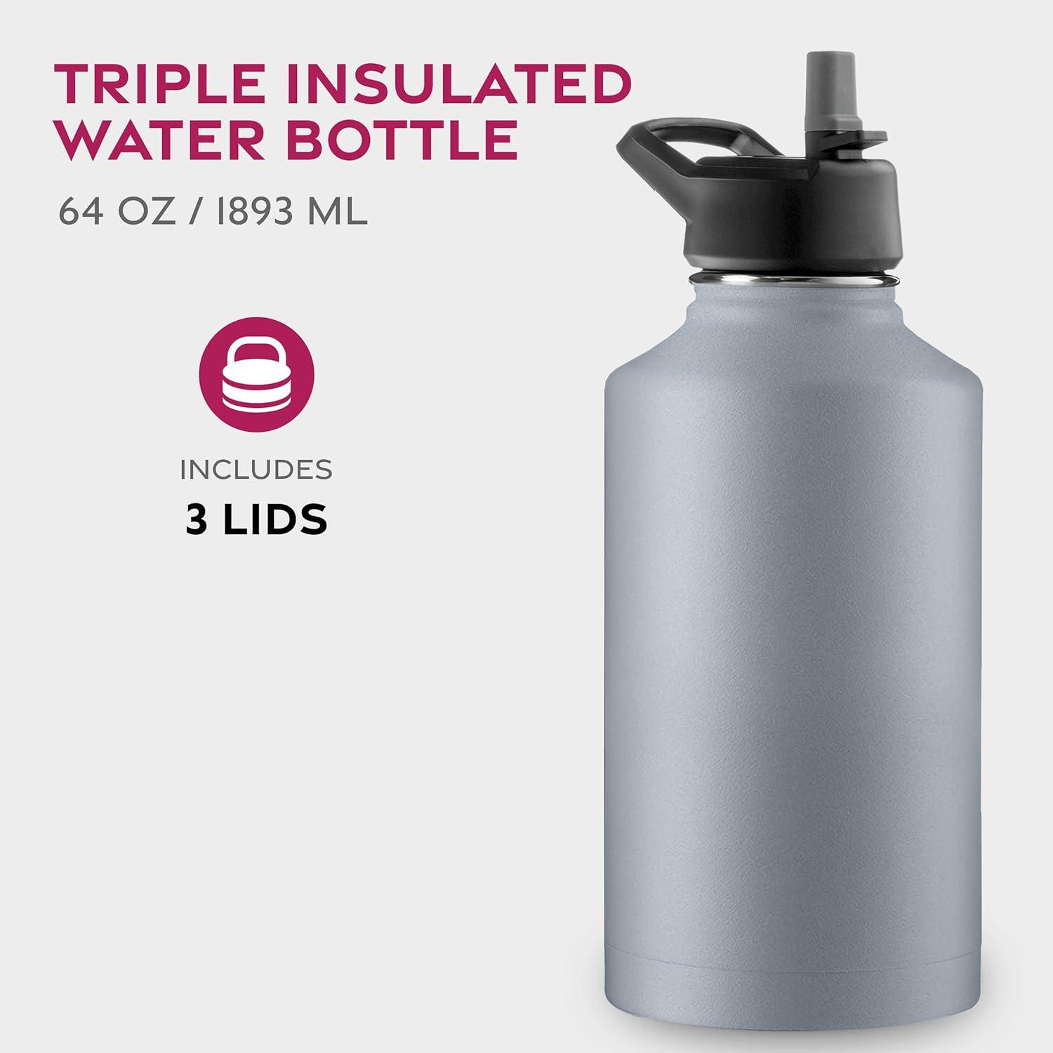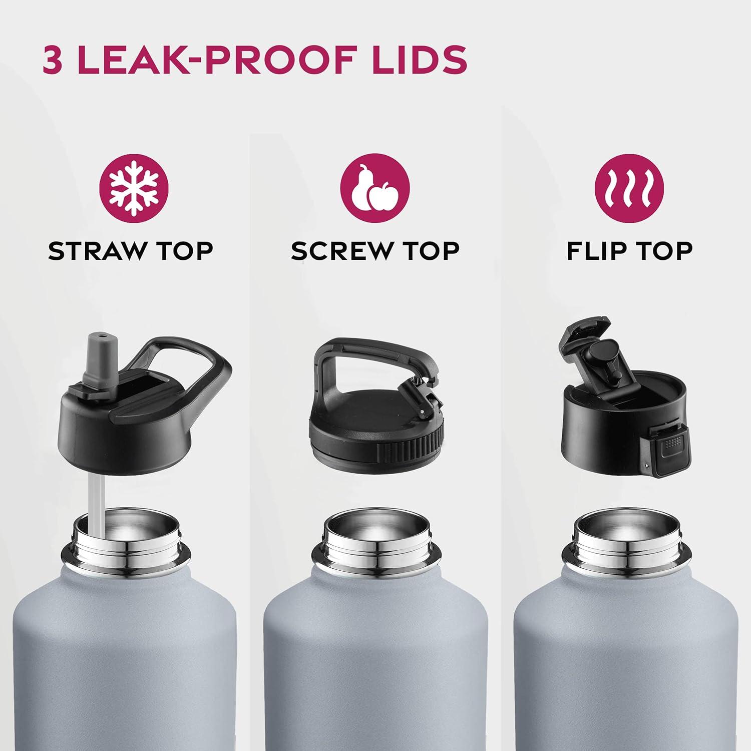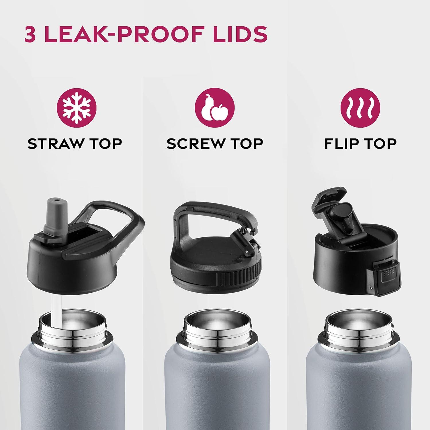VERSATILE LIDS: Our drinking bottle comes with three individual lids to serve all your needs. Sip hot drinks with the mouthpiece, enjoy cold beverages with the straw, and use the removable lid for ice or fruit drinks. All tops offer leak proof seals.
